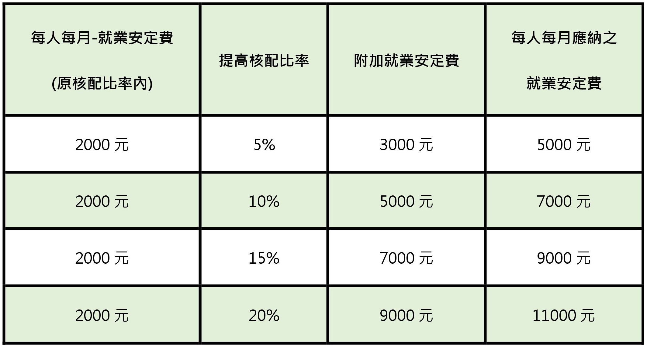可透過繳納附加就業安定費(Extra)提高核配比率,每月得外加就業安定費如下,最高使用比率(含原本核配的比率)合計不可超過總僱用人數的40%。