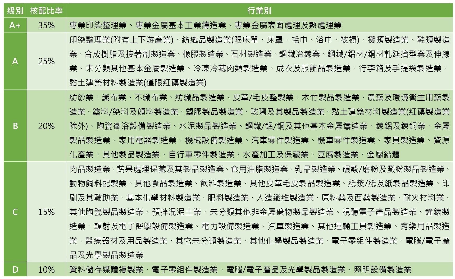 1.製造業3K五級制:有105個行業適用,分為A+級(核配比率35%)、A級(核配比率25%)、B級(核配比率20%)、C級(核配比率15%)、D級(核配比率10%)